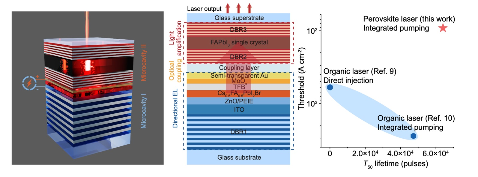 Láseres semiconductoresson fuentes de luz importantes en informática. Los semiconductores de perovskita son una nueva clase de materiales láser con bajos costos operativos y fácil integración en plataformas optoelectrónicas basadas en silicio. Sus espectros de emisión sintonizables permiten que los láseres accionados ópticamente alcancen el umbral de emisión más bajo posible, lo que abre importantes oportunidades tecnológicas. La energía externa necesaria para impulsar los láseres normalmente se proporciona en dos formas: energía eléctrica y energía óptica. Sin embargo, el control óptico normalmente requiere fuentes de luz externas de alta calidad, lo que limita la cantidad de dispositivos viables. El desarrollo de láseres de perovskita accionados eléctricamente es un desafío fundamental en la optoelectrónica de perovskita.